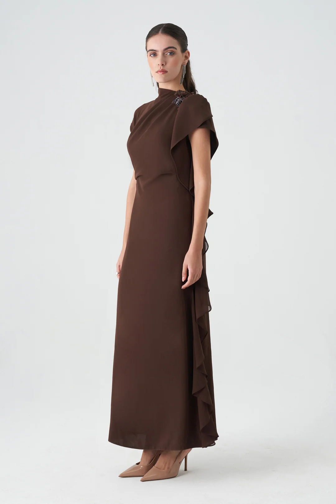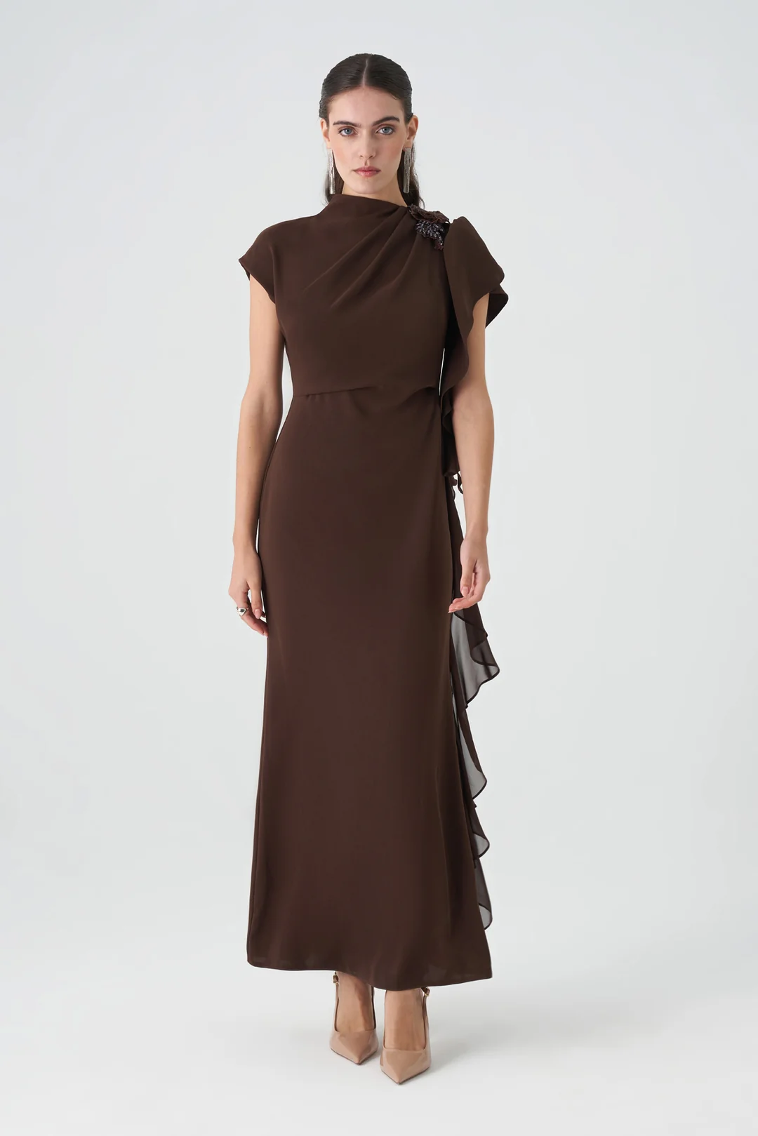 Model: Tek omuz, volan detaylı uzun abiye elbise