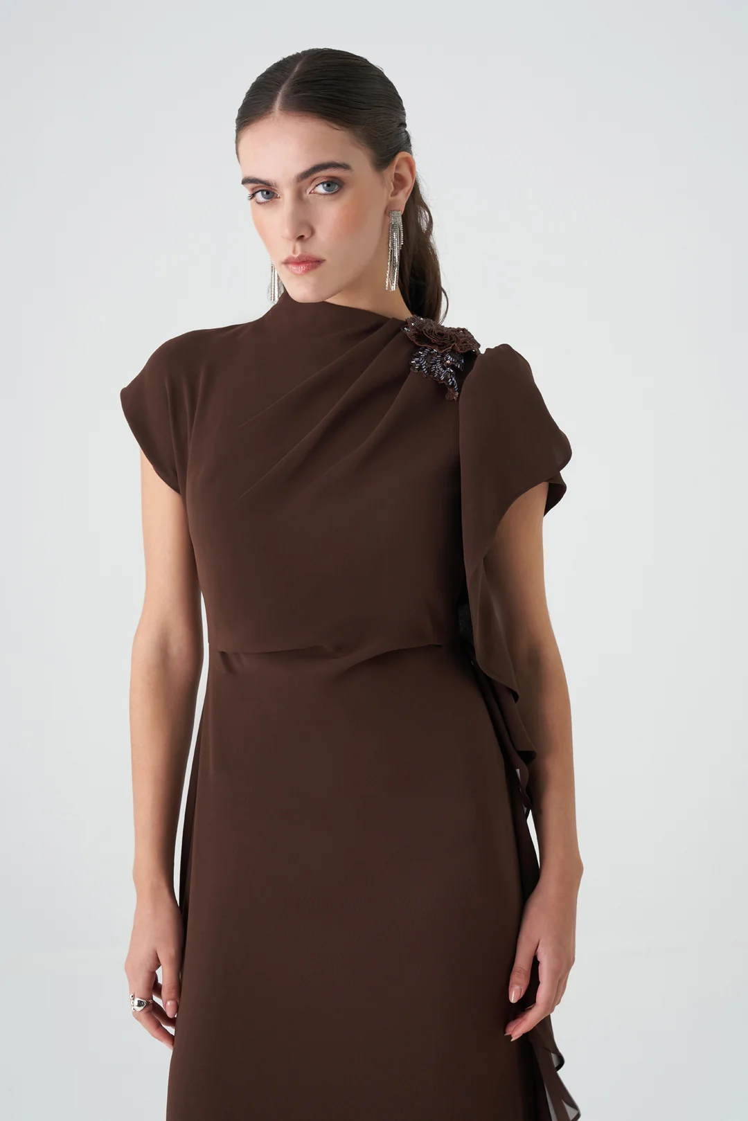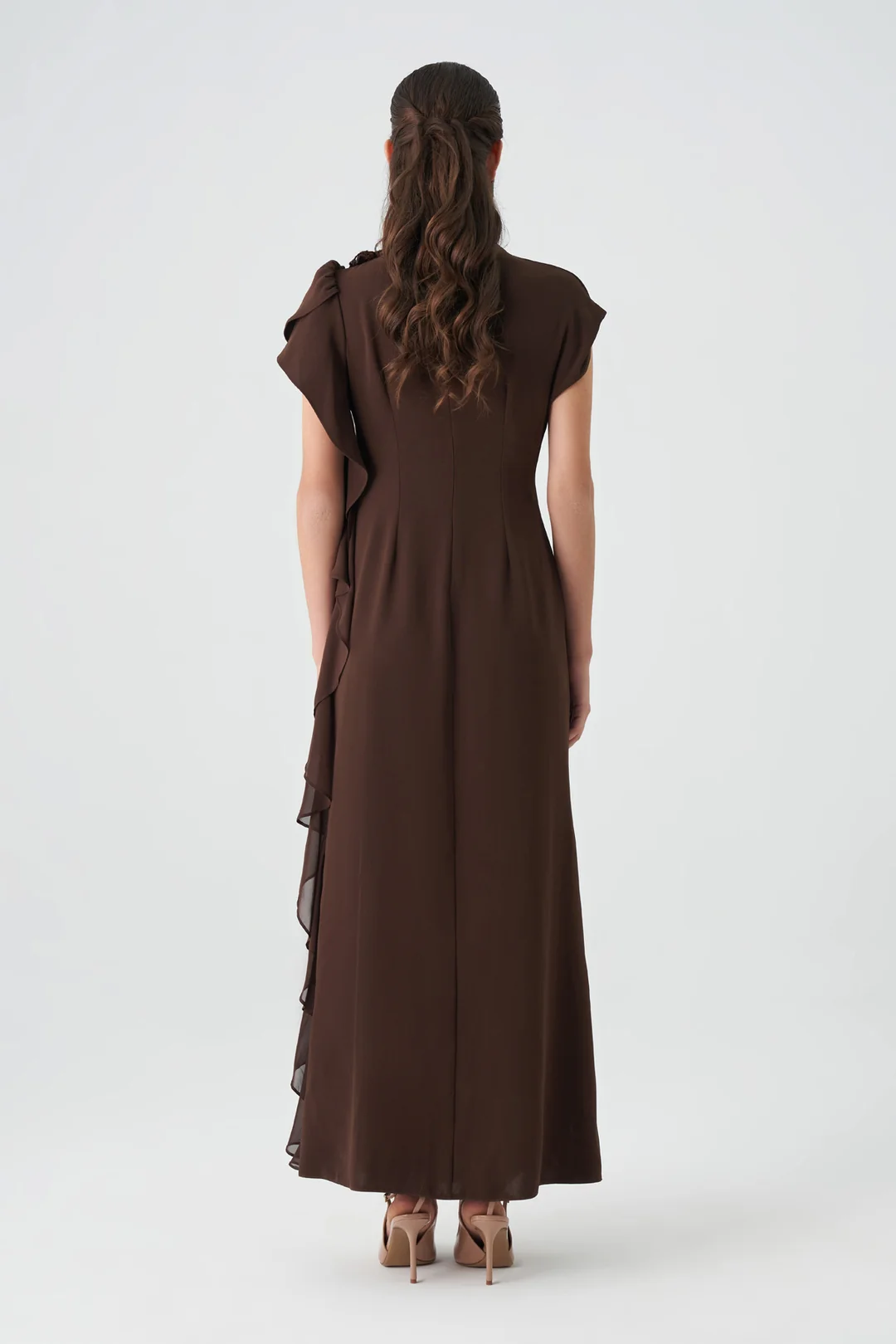Detay: Omuzda çiçek aksesuarı ve arkada zarif volanlar