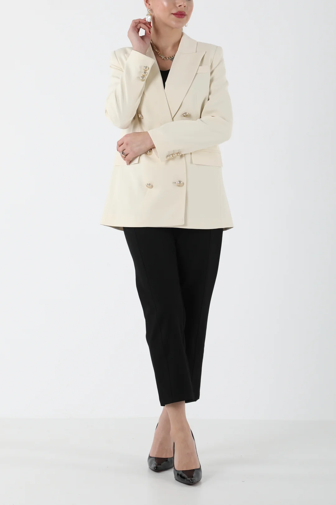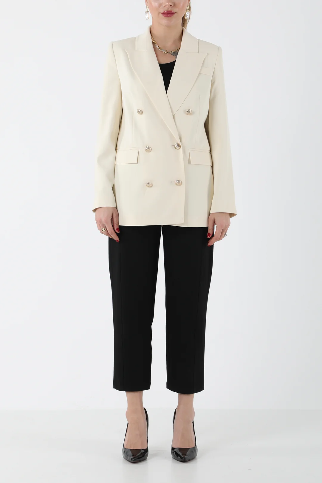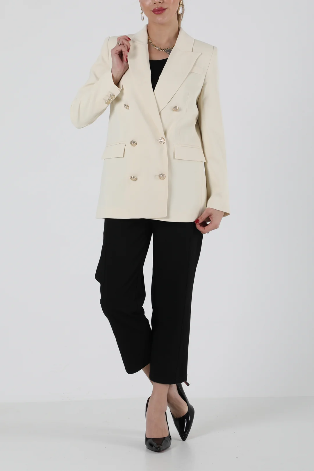 Modern ve zarif çizgilere sahip bej kruvaze blazer ceket, siyah pantolonla kombinlenerek hem ofis şıklığında hem de özel davetlerde sofistike bir görünüm sunar. Minimal tasarımı ve güçlü duruşuyla gardırobunuzun vazgeçilmez takımlarından biri olacak.