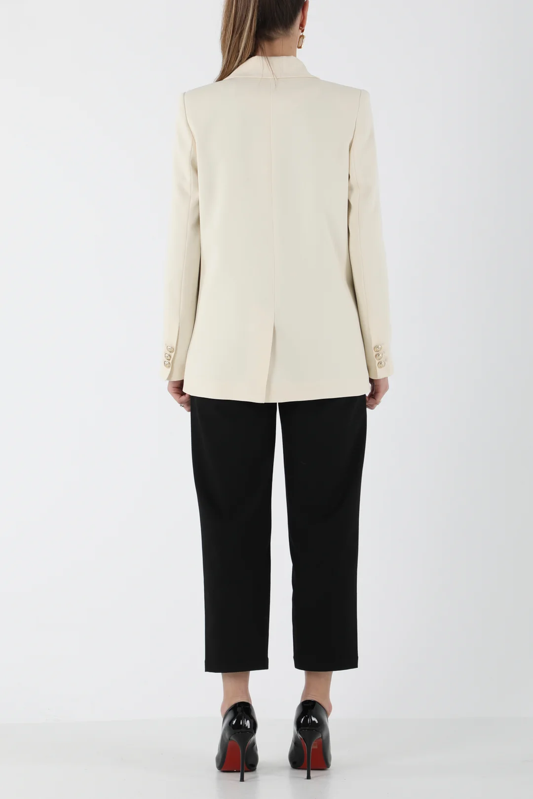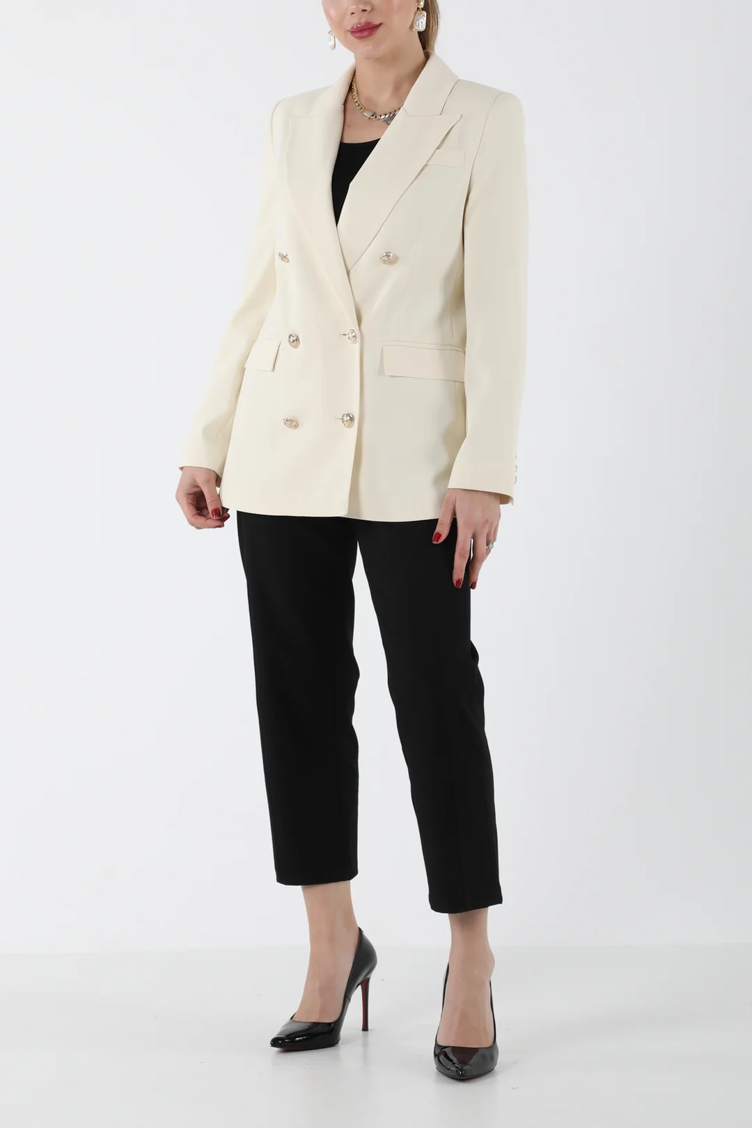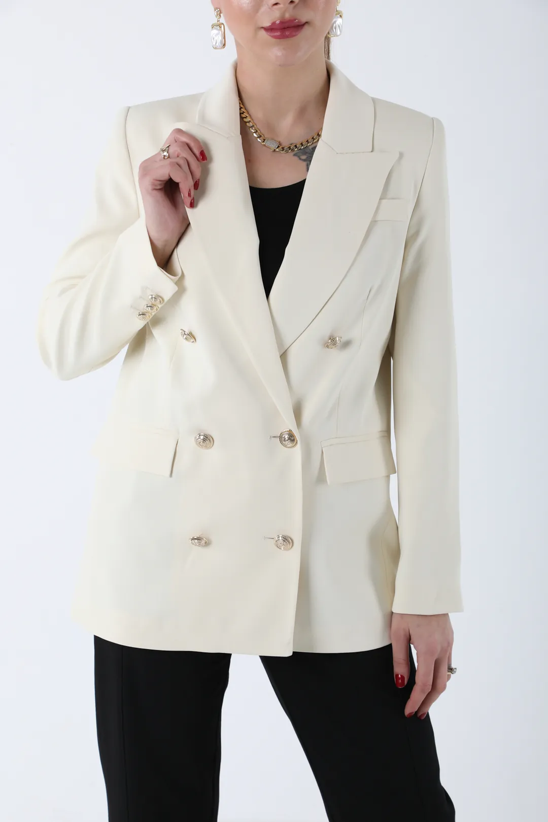 Modern ve zarif çizgilere sahip bej kruvaze blazer ceket, siyah pantolonla kombinlenerek hem ofis şıklığında hem de özel davetlerde sofistike bir görünüm sunar. Minimal tasarımı ve güçlü duruşuyla gardırobunuzun vazgeçilmez takımlarından biri olacak.