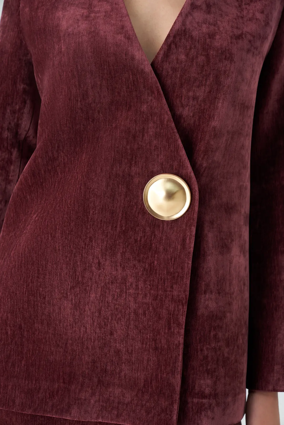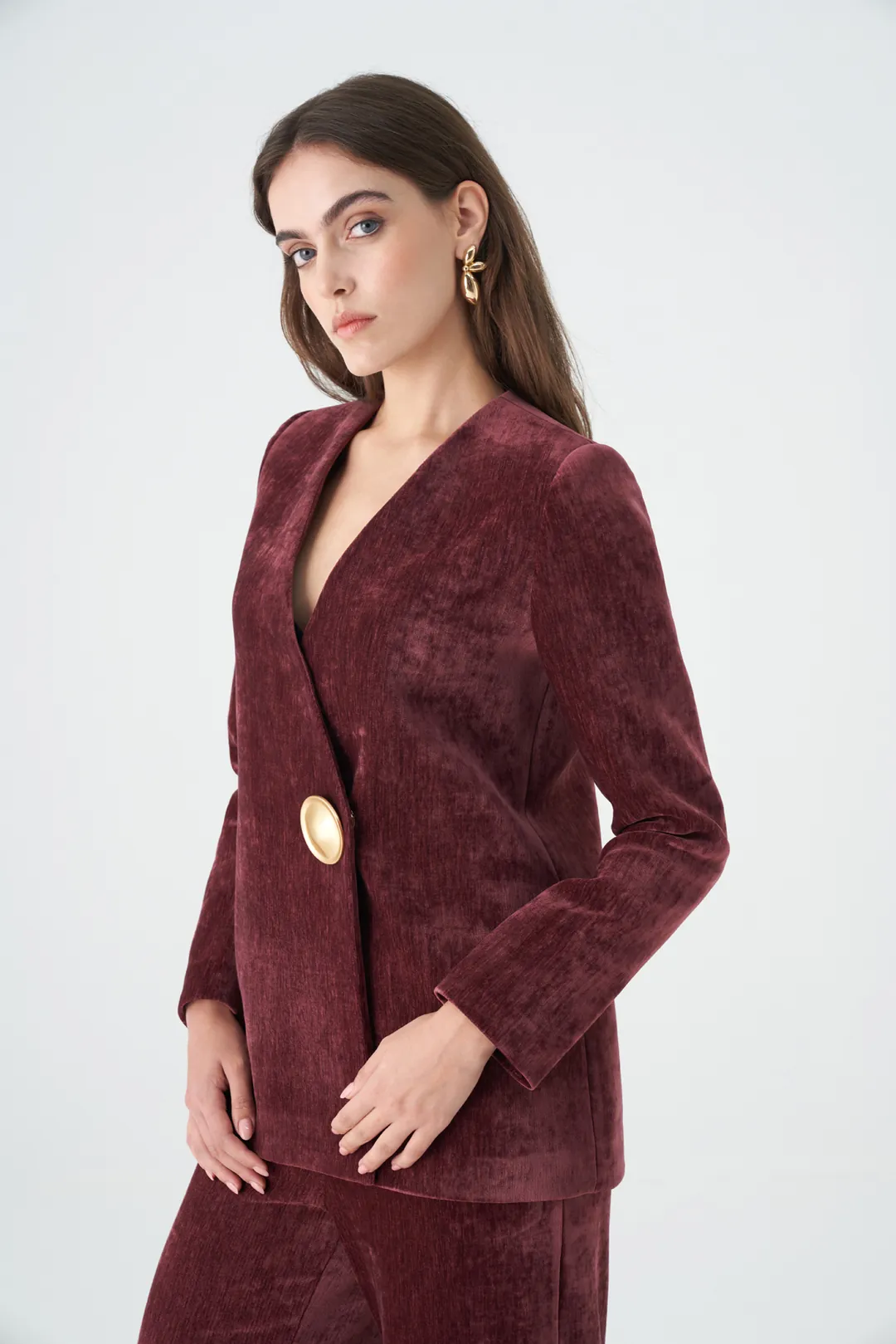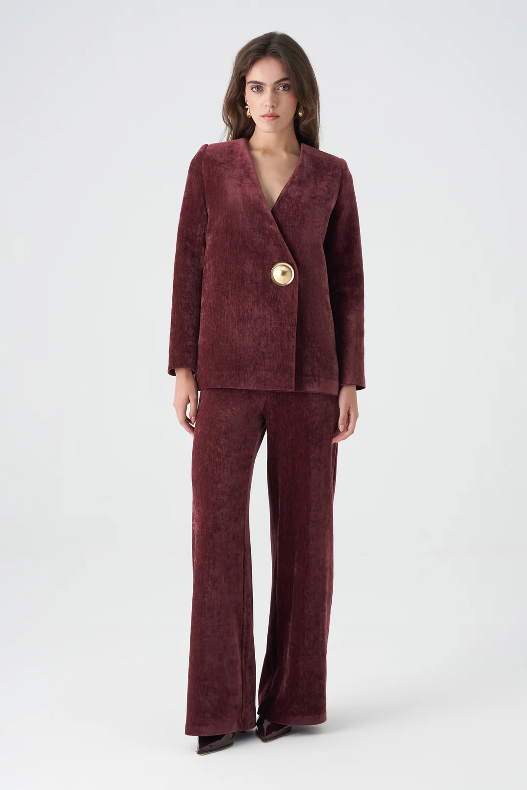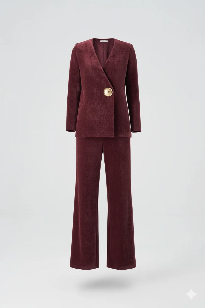 Lüks dokunuşların modern yansıması: bordo kadife görünümlü gold düğmeli kadın takım, zarafet ve gücü bir arada sunan şık bir siluet oluşturur. Yumuşak ve parlak dokulu kumaşı, ışıltılı görünümüyle sonbahar-kış sezonuna sofistike bir dokunuş katar. Tek büyük gold düğme detayı, sade formu modern bir ışıltıyla tamamlar.