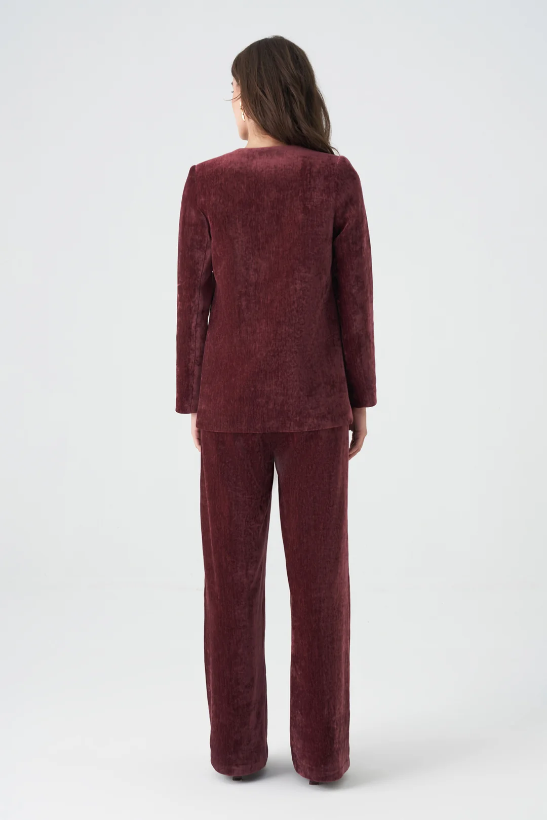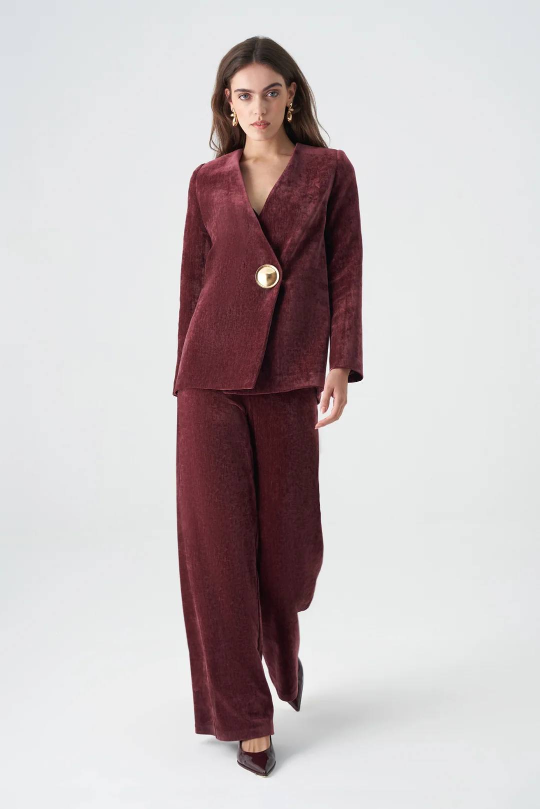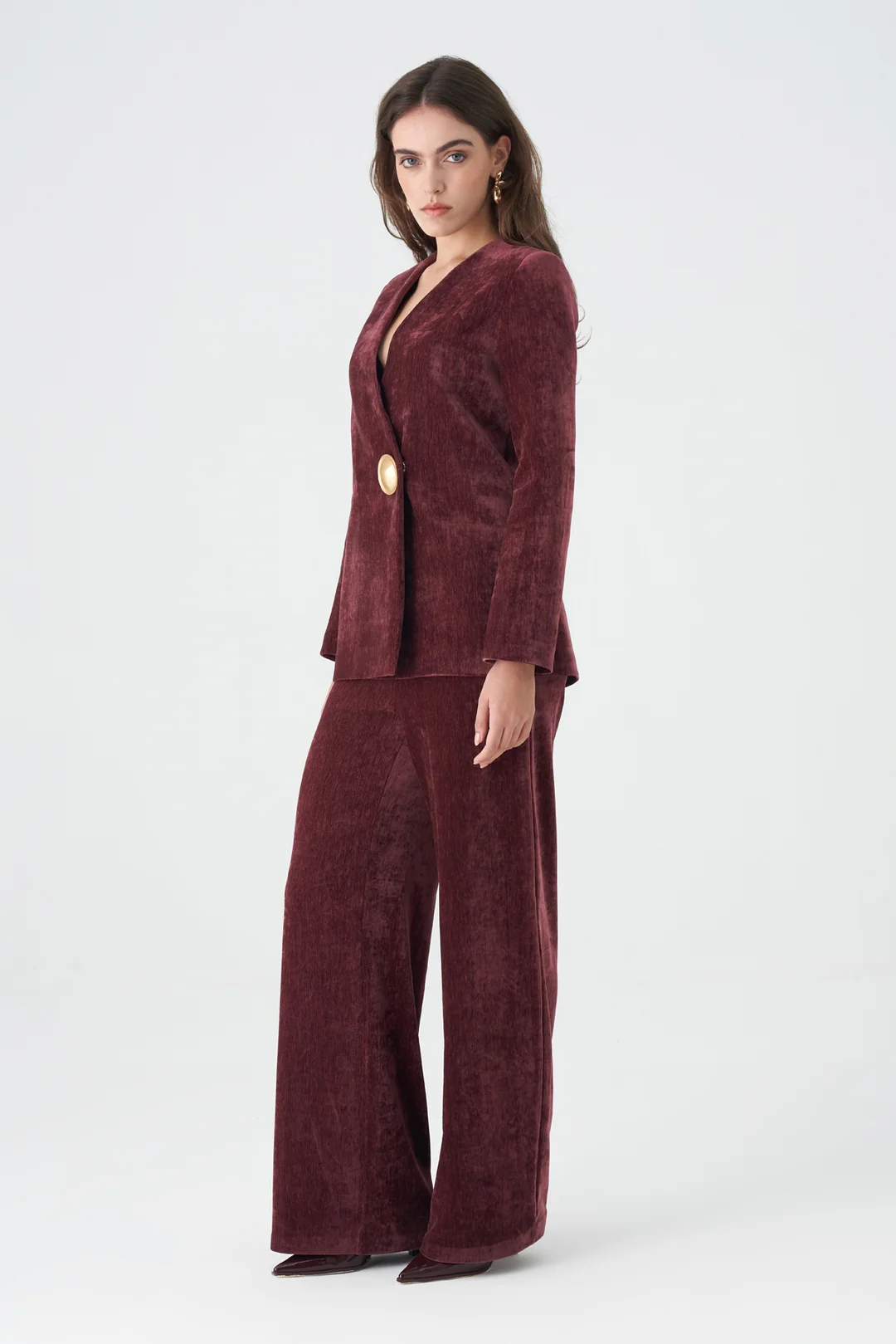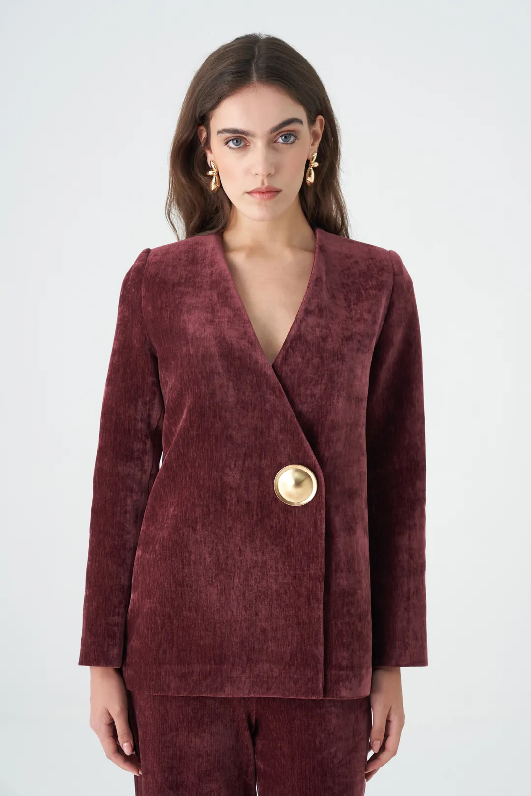Lüks dokunuşların modern yansıması: bordo kadife görünümlü gold düğmeli kadın takım, zarafet ve gücü bir arada sunan şık bir siluet oluşturur. Yumuşak ve parlak dokulu kumaşı, ışıltılı görünümüyle sonbahar-kış sezonuna sofistike bir dokunuş katar. Tek büyük gold düğme detayı, sade formu modern bir ışıltıyla tamamlar.