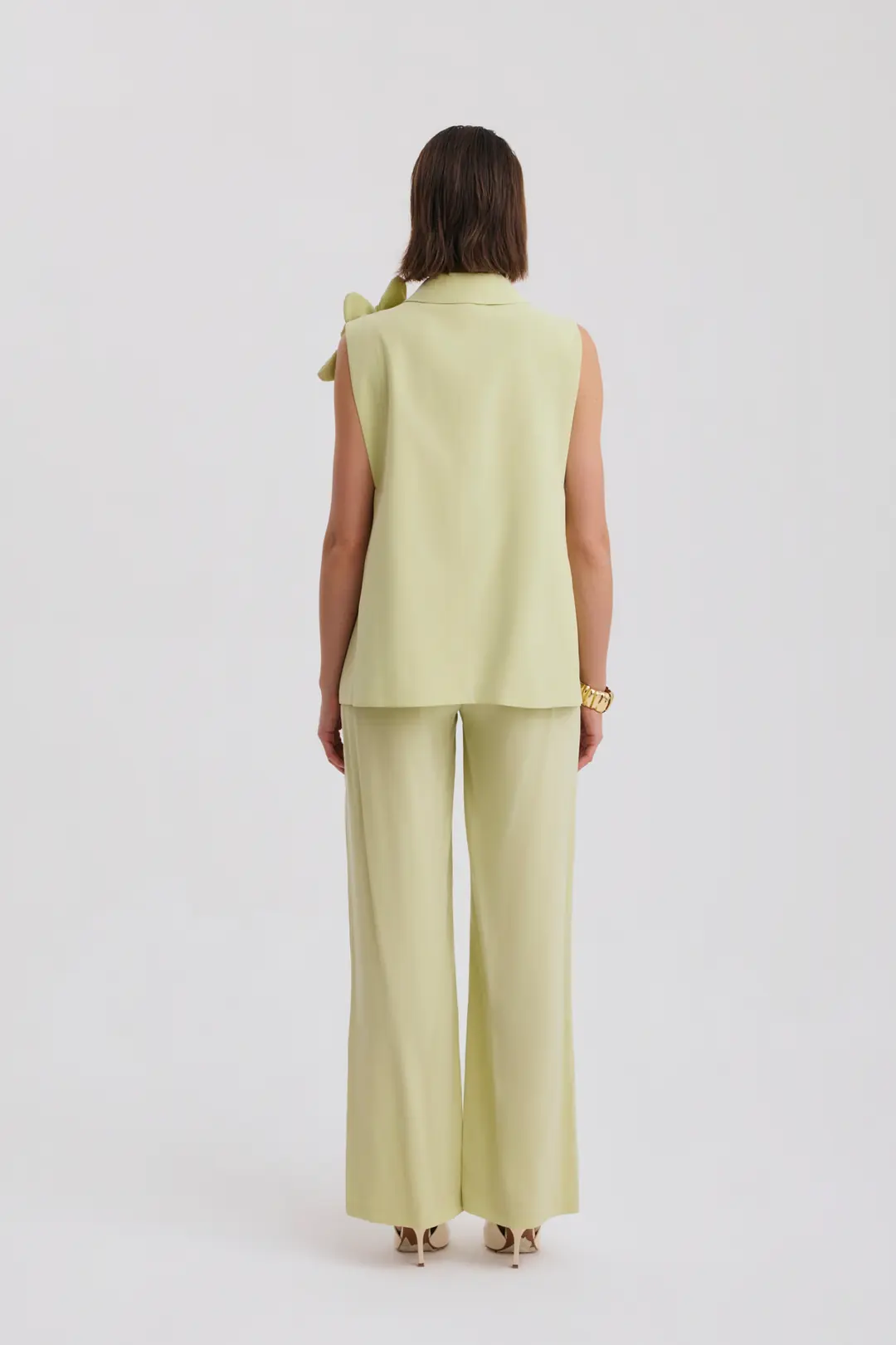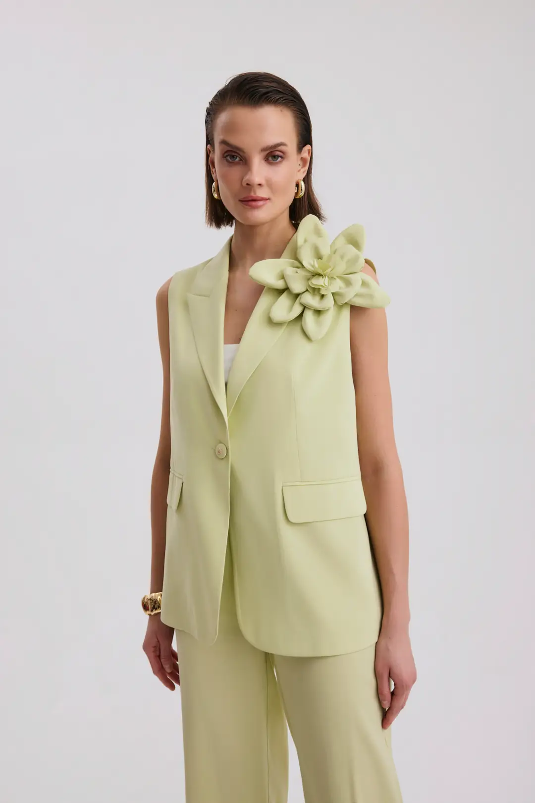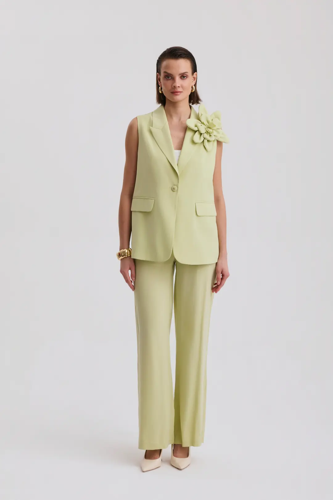 Modern ve zarif tasarım çizgileriyle öne çıkan bu takım, güçlü ve sofistike bir stil sunar. Yelek formundaki üst parça klasik kesimi modern bir dokunuşla yorumlarken, omuz kısmında yer alan dekoratif çiçek detayı tasarıma dikkat çekici bir şıklık katar. Akıcı kesime sahip pantolon ise silueti dengeli bir şekilde tamamlayarak hem konforlu hem de zarif bir görünüm sağlar.