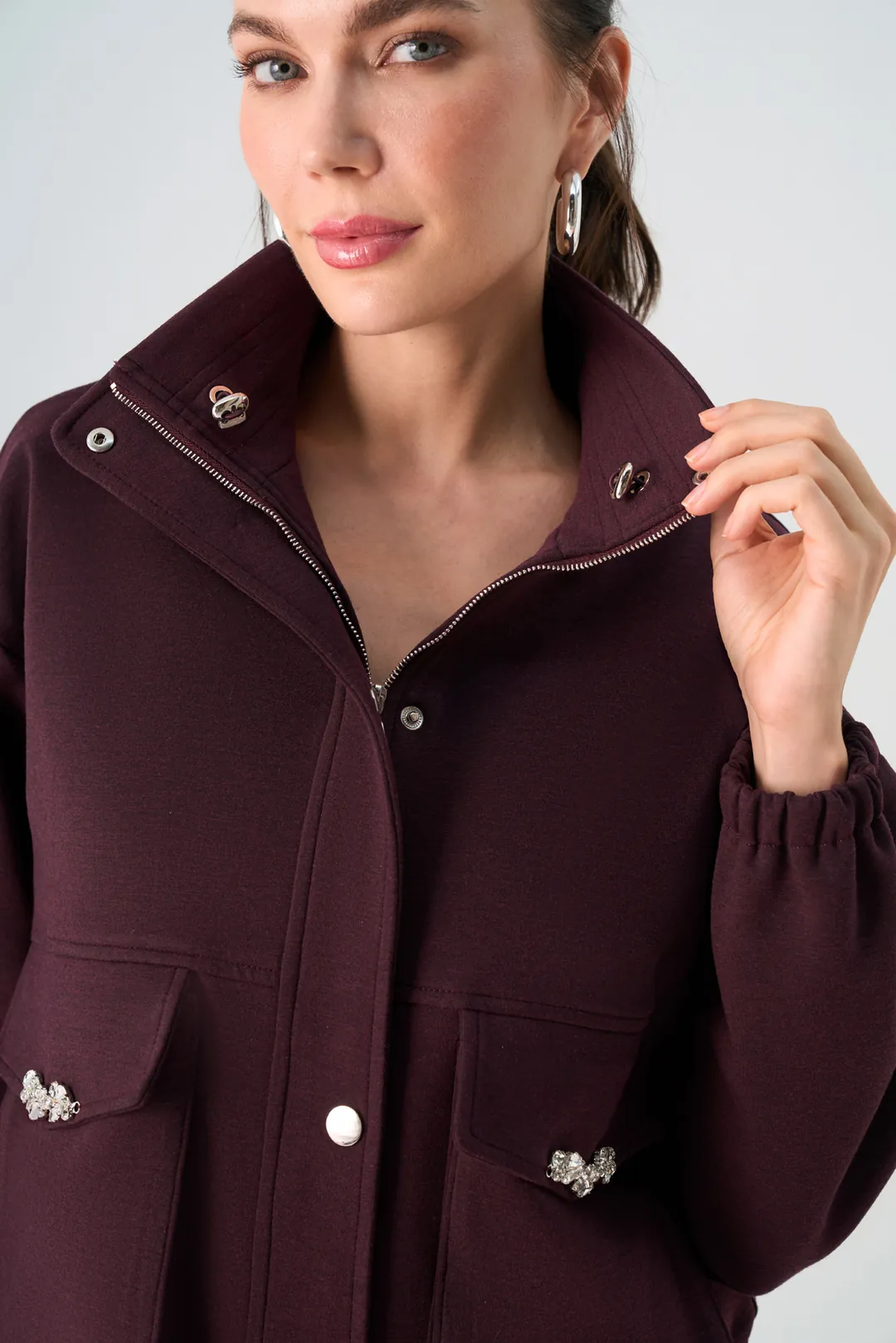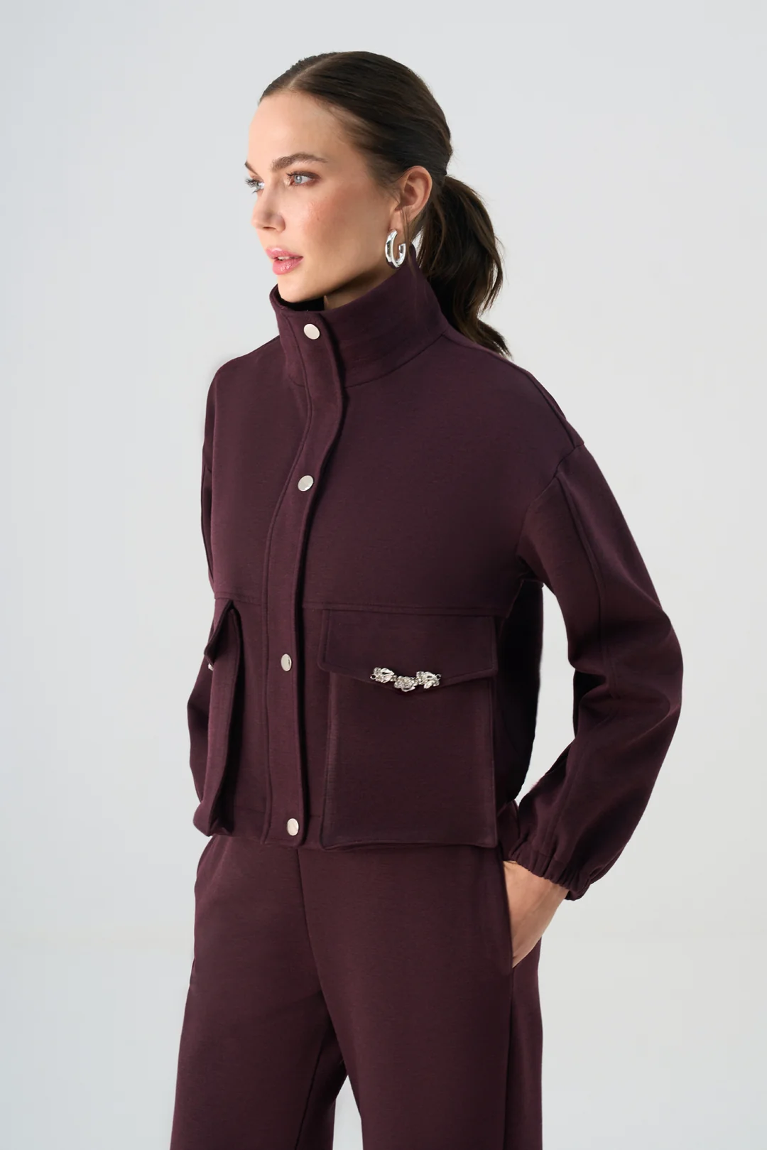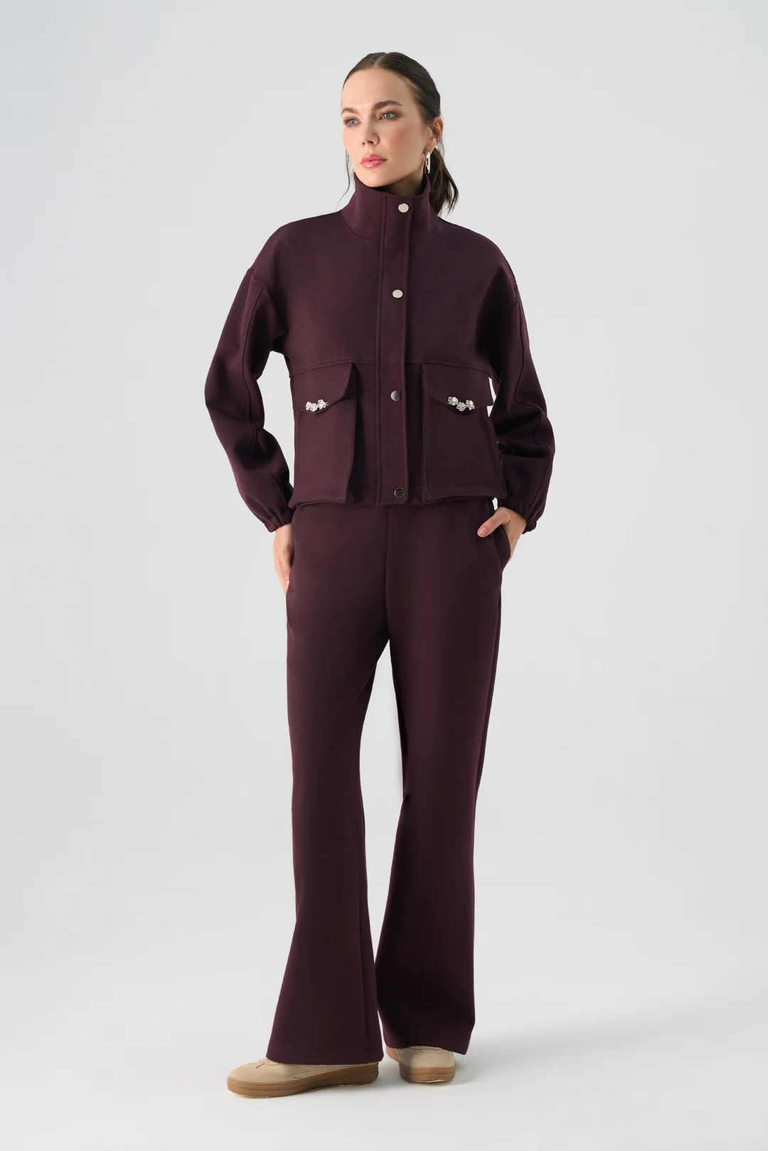 Modern çizgilerle tasarlanmış bu rahat ve şık takım, günlük stillerde sofistike bir görünüm sunar. Yapısal formu ve dik yaka detayıyla sportif bir zarafet yansıtırken, cepler üzerindeki taş işlemeler tasarıma göz alıcı bir dokunuş ekler. Yumuşak dokulu kumaşı sayesinde konforlu bir kullanım sunan takım, hem şehir yaşamında hem de seyahatlerde zarif bir alternatif oluşturur.