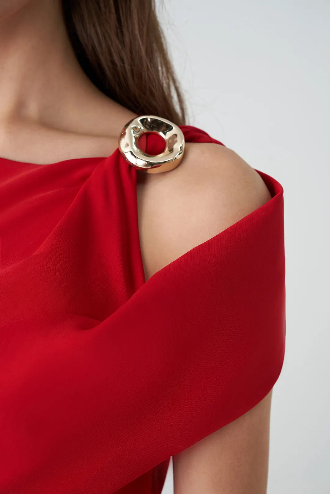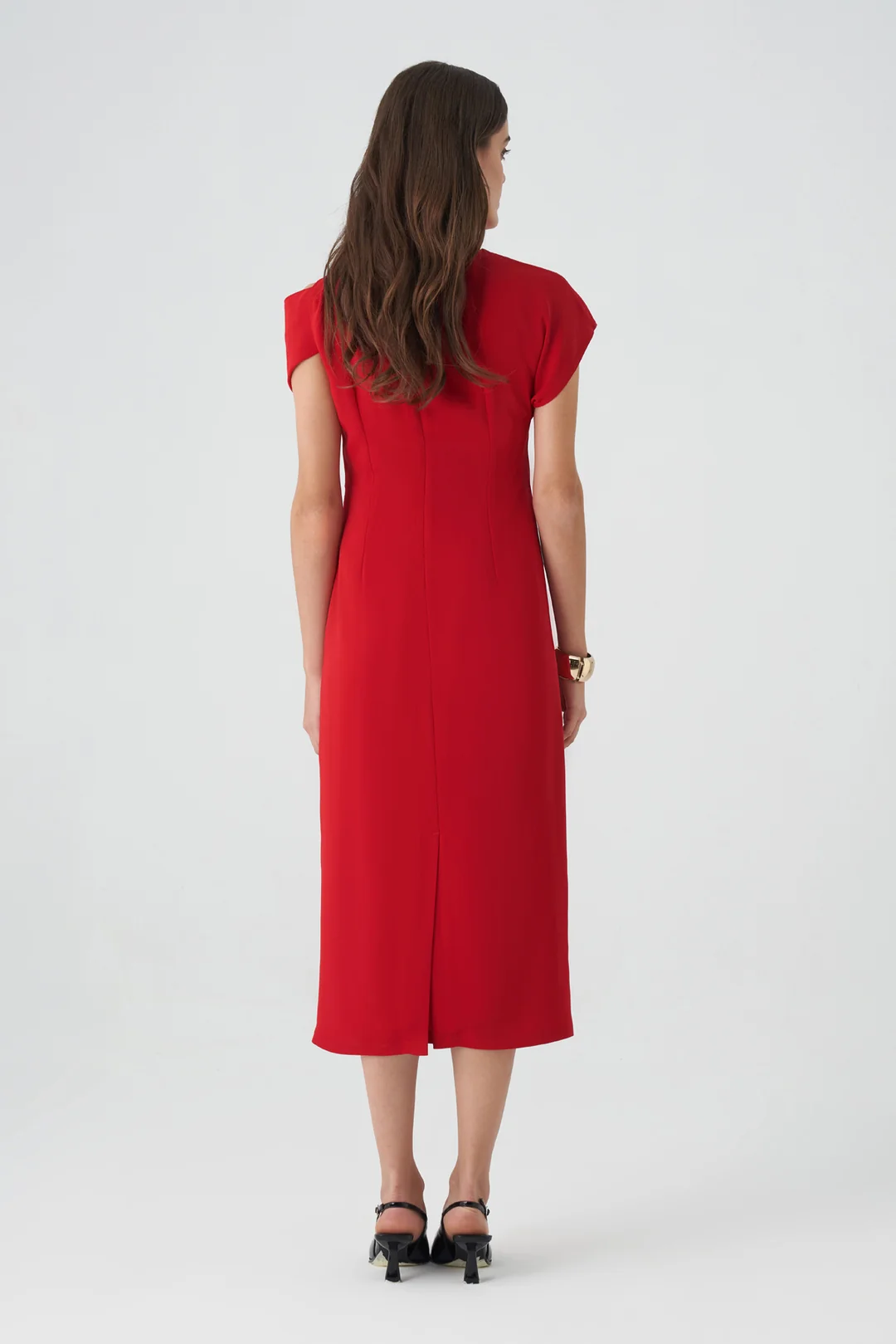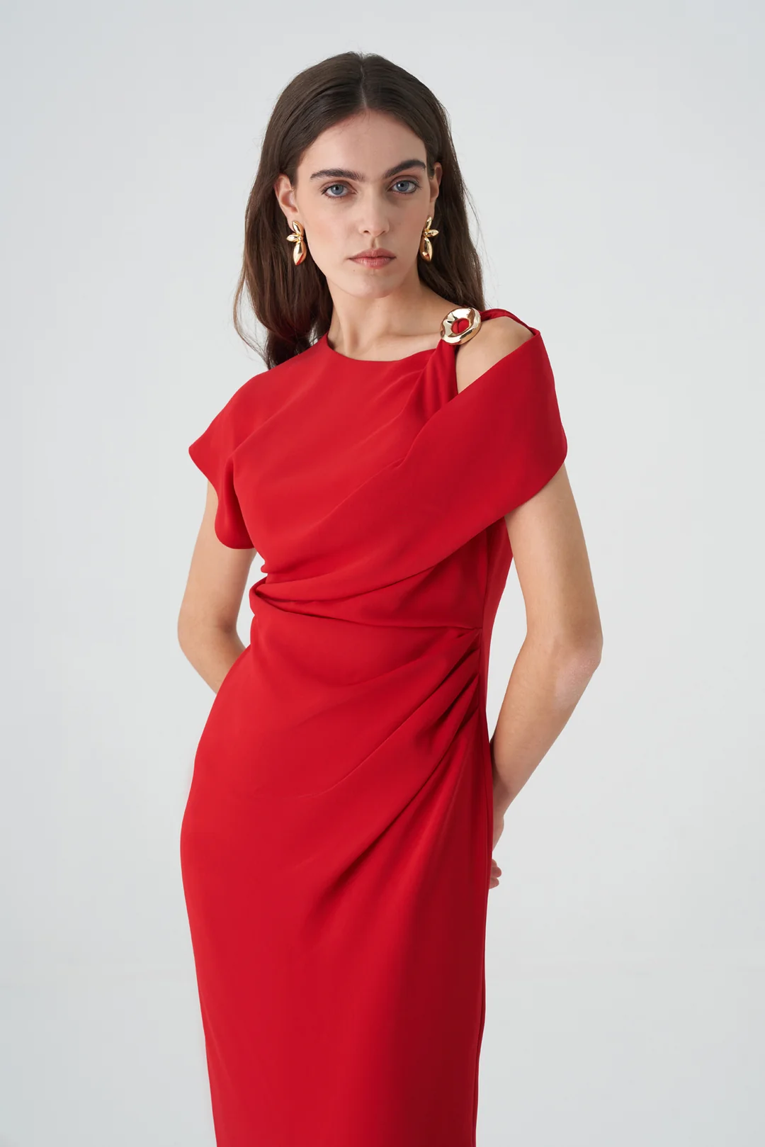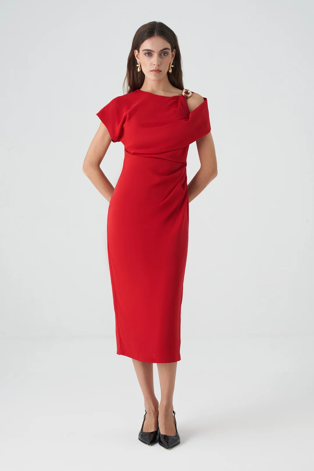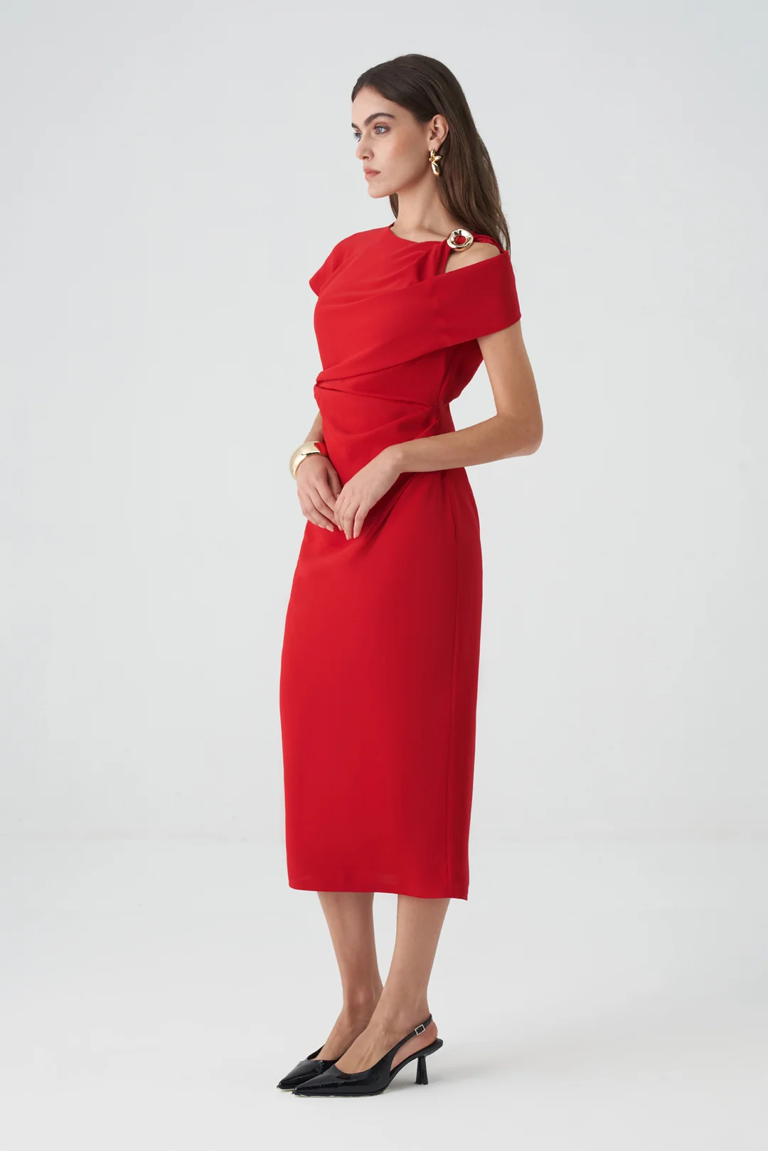 Zamansız şıklığı modern dokunuşlarla buluşturan bu kırmızı midi elbise, asimetrik omuz kesimi ve drape detaylarıyla dikkat çekiyor. Bel kısmındaki büzgülü tasarım, vücut hatlarını zarifçe öne çıkarırken sofistike bir siluet sunuyor. Rahat kalıbı sayesinde özel davetlerden kokteyllere kadar pek çok ortamda şıklığınızı tamamlar. Yumuşak dokusu ve midi boyu ile hem zarif hem de iddialı bir görünüm elde etmenizi sağlar.