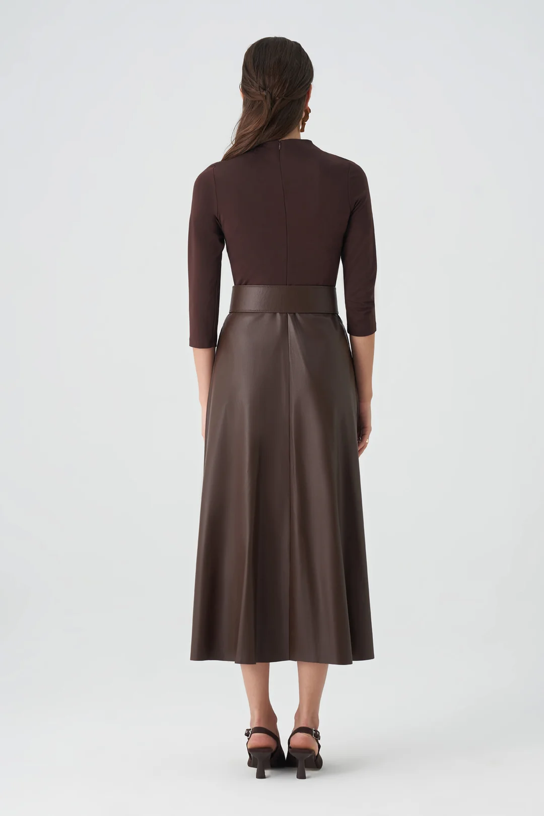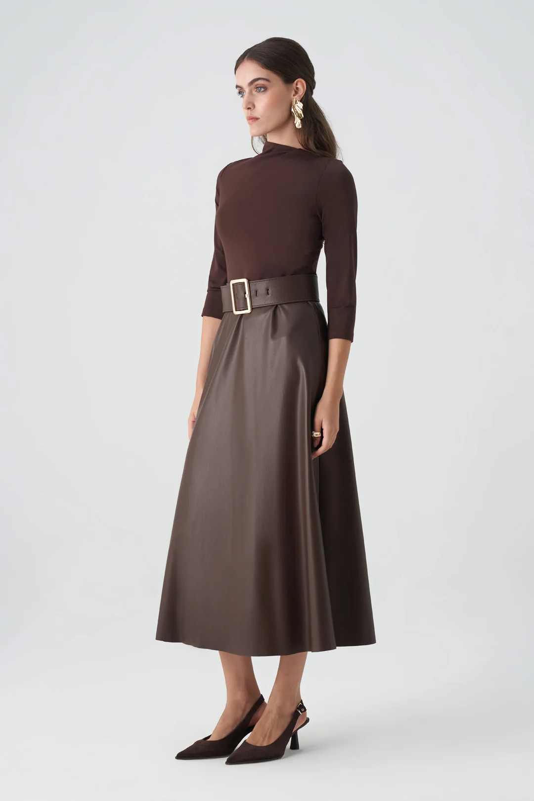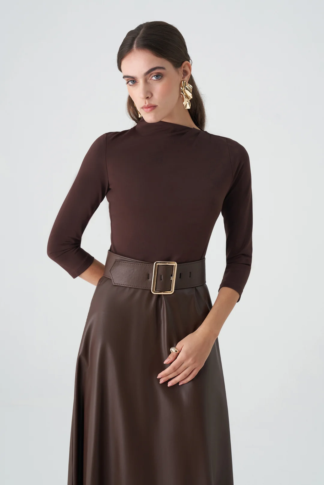 Modern çizgileriyle dikkat çeken bu kahverengi midi elbise, sade ama güçlü bir siluet sunar. Vücuda oturan üst kısmı ve genişleyen etek kesimi, zarif bir denge oluştururken, kalın kemer detayı bel hattını vurgulayarak feminen bir duruş kazandırır. Üç çeyrek kollu tasarımı sayesinde mevsim geçişlerinde konforlu bir kullanım sağlar. Minimal ama etkileyici detaylarıyla hem ofis şıklığı hem de özel davetler için mükemmel bir tercihtir.