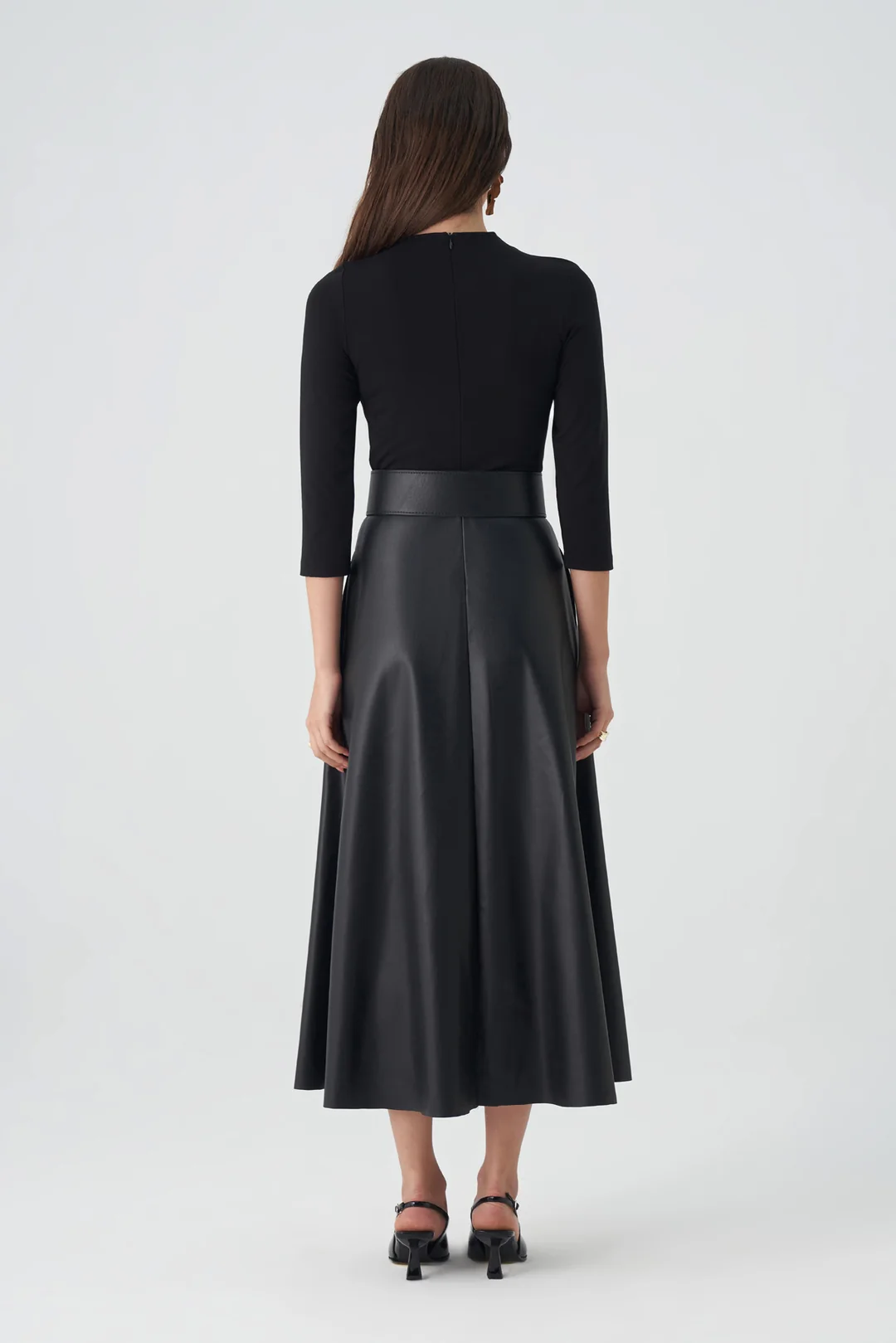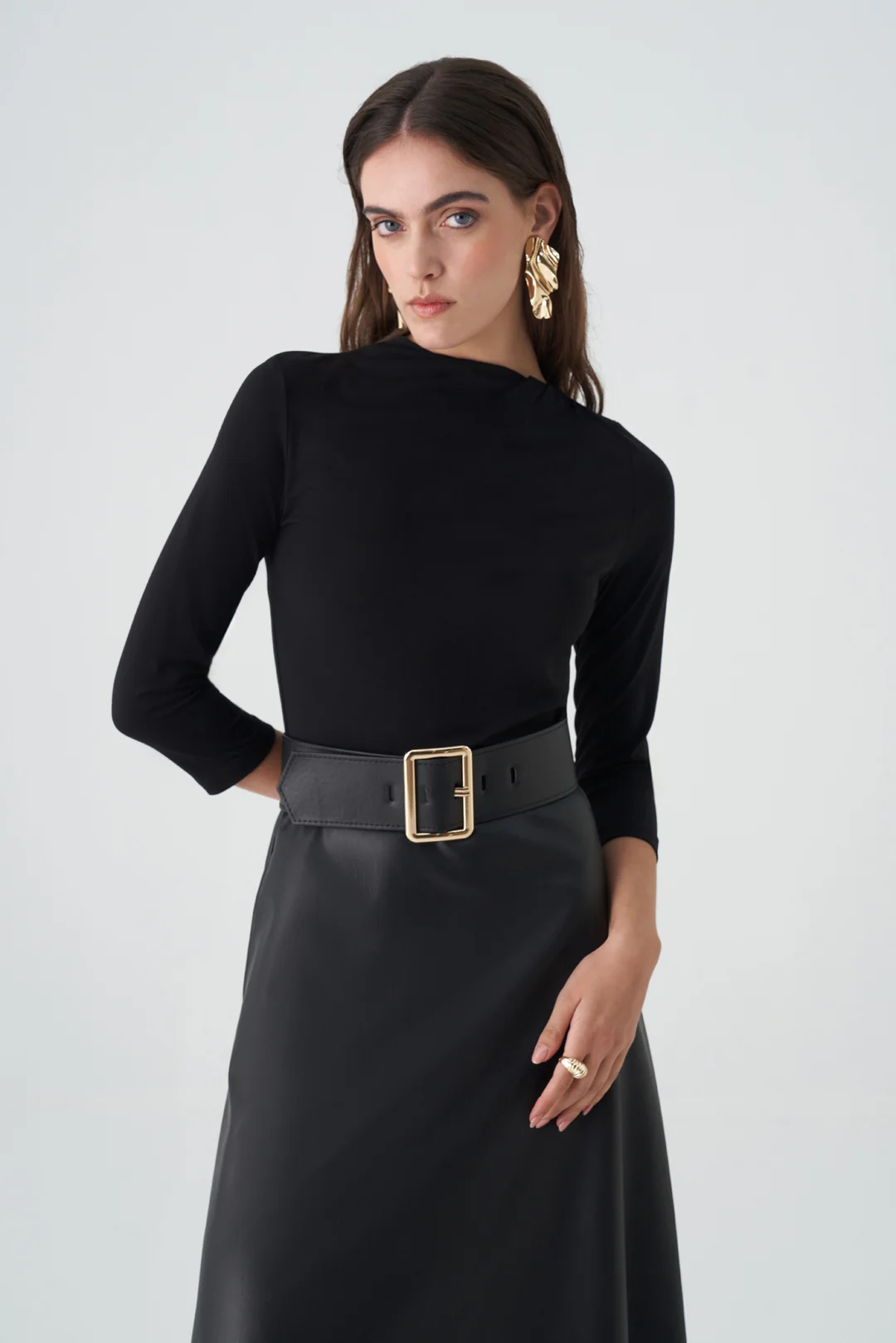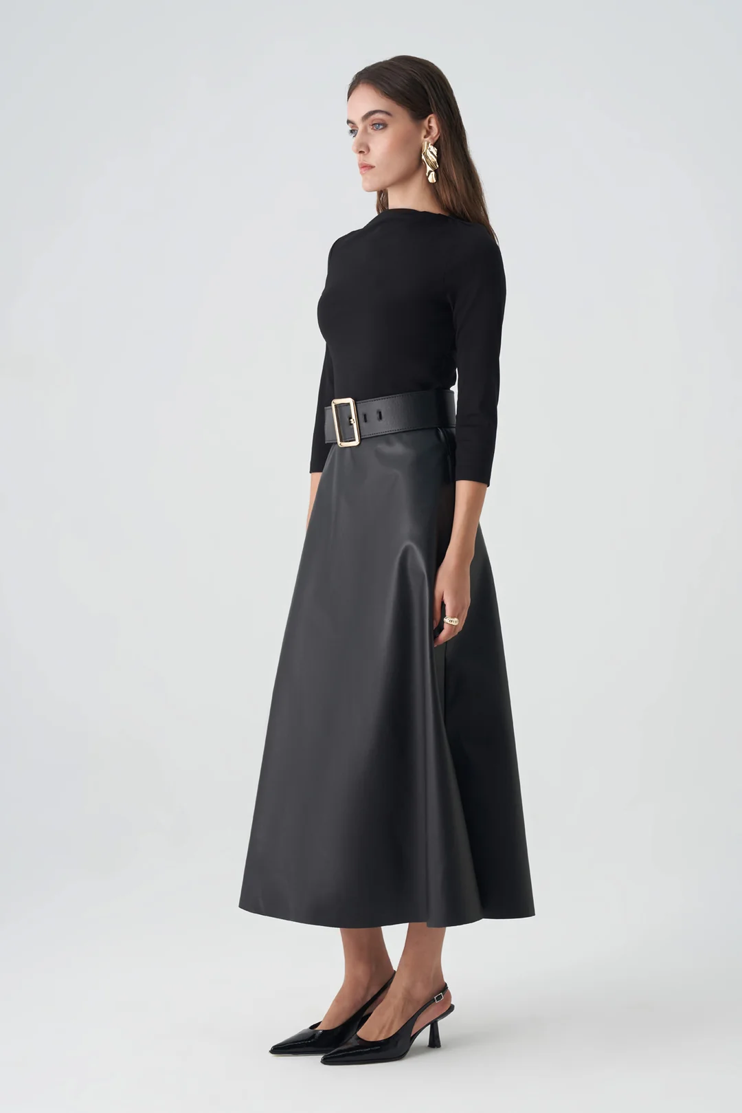 Modern çizgileriyle dikkat çeken bu kahverengi midi elbise, sade ama güçlü bir siluet sunar. Vücuda oturan üst kısmı ve genişleyen etek kesimi, zarif bir denge oluştururken, kalın kemer detayı bel hattını vurgulayarak feminen bir duruş kazandırır. Üç çeyrek kollu tasarımı sayesinde mevsim geçişlerinde konforlu bir kullanım sağlar. Minimal ama etkileyici detaylarıyla hem ofis şıklığı hem de özel davetler için mükemmel bir tercihtir.