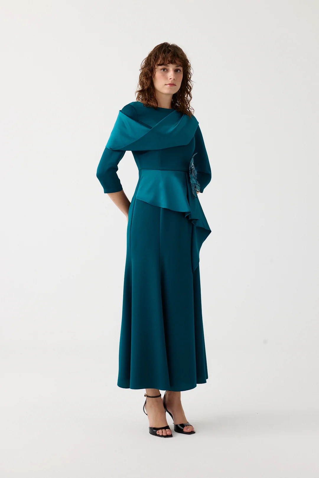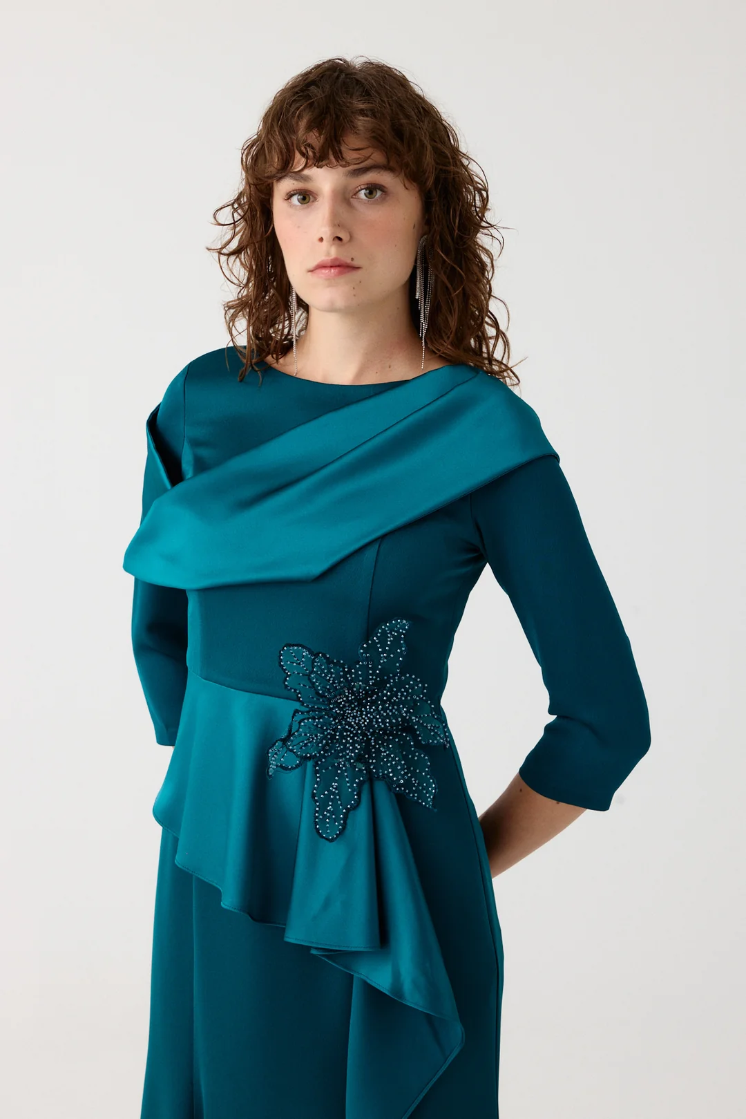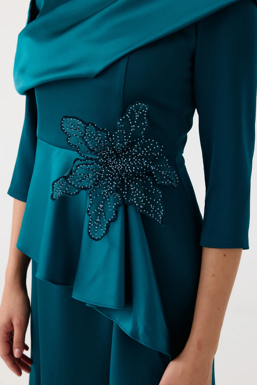 Detay: Drapeli üst tasarım, bel kısmında işlemeli aksesuar