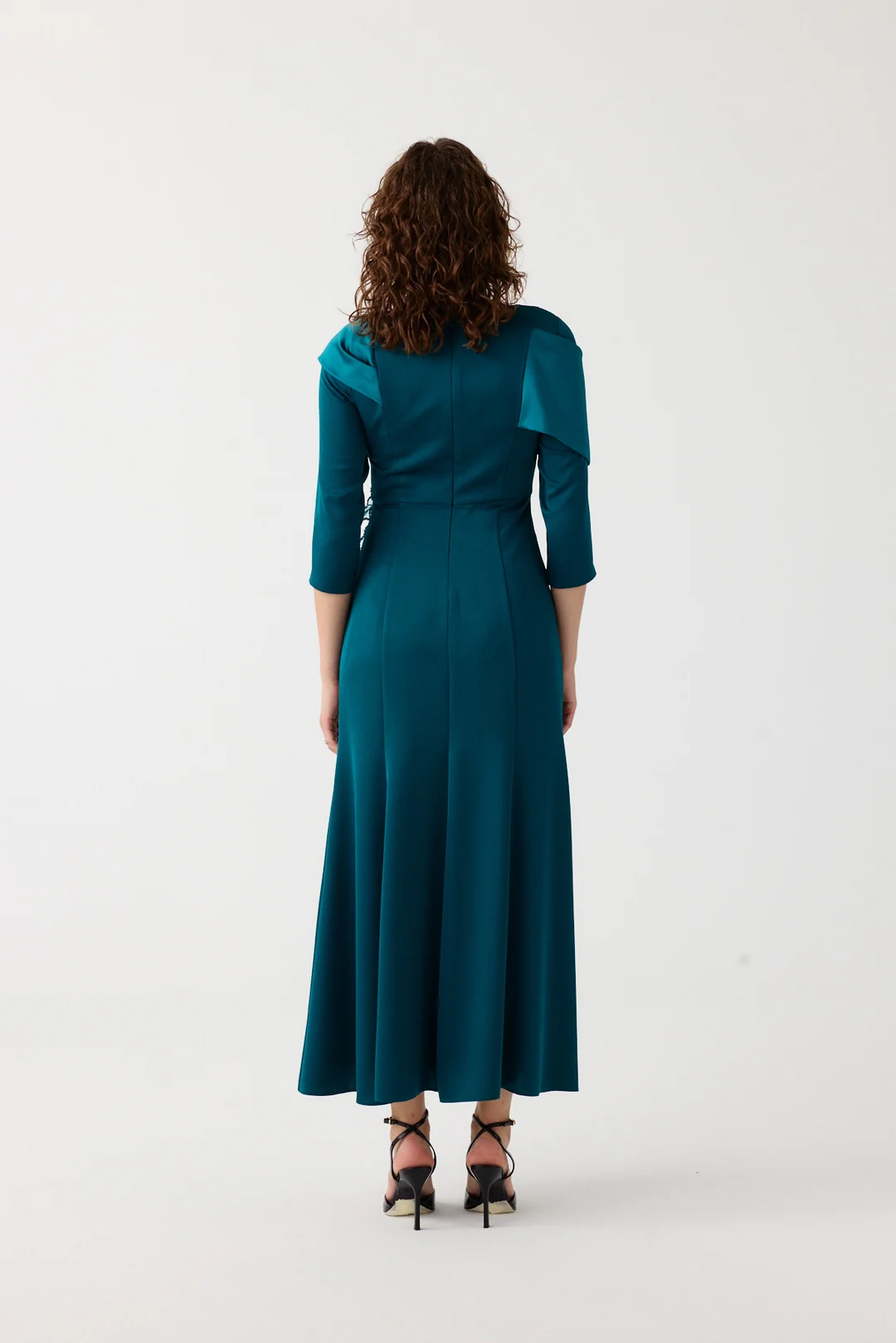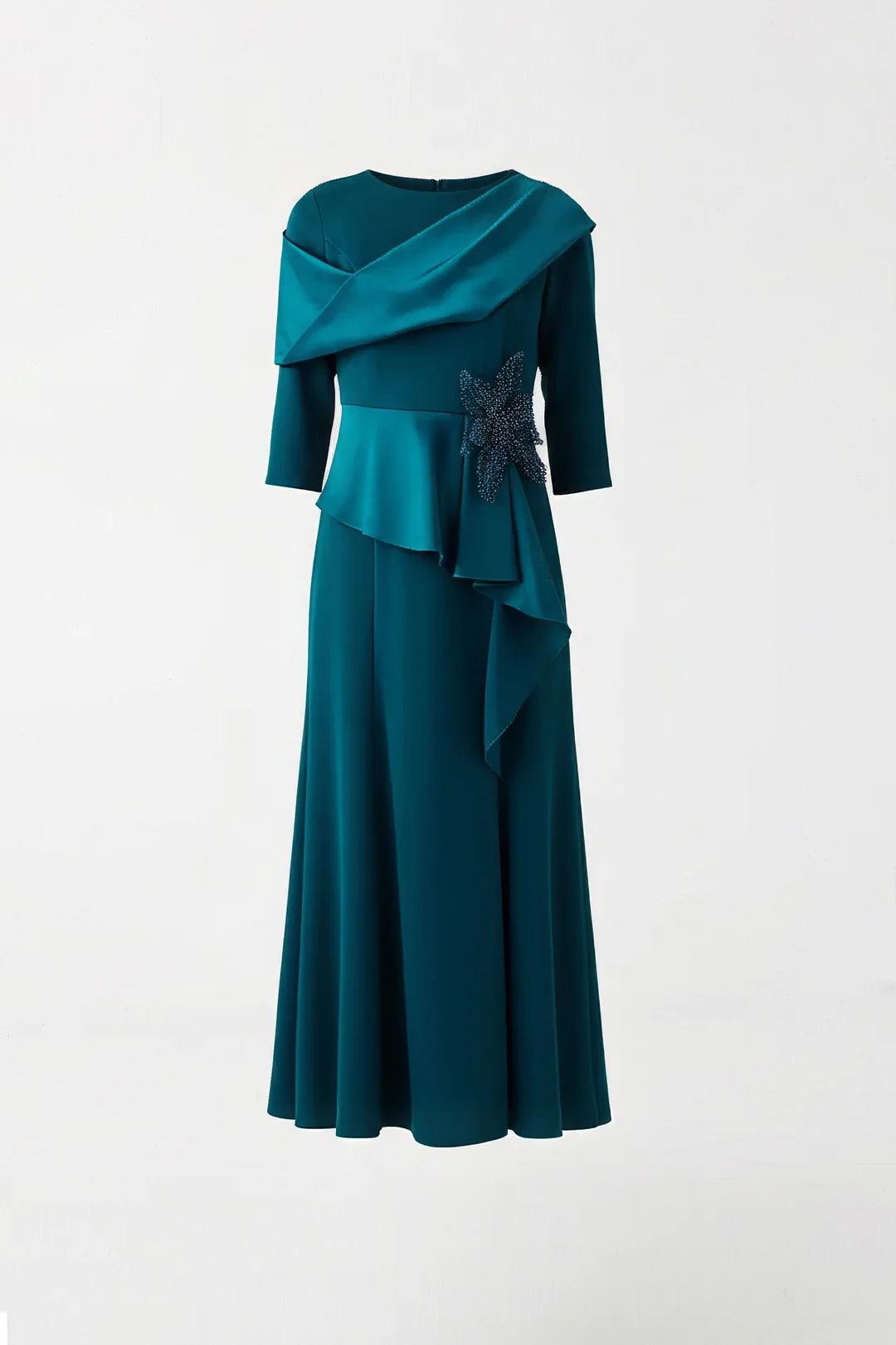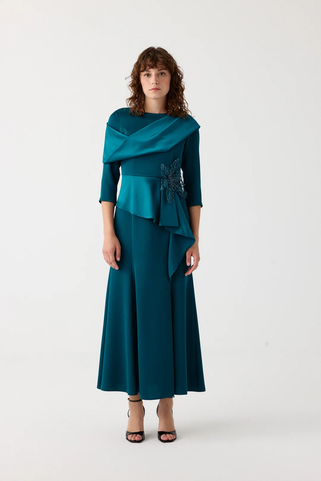 Feminen şıklığı modern dokunuşlarla buluşturan mürdüm uzun elbise, drapeli tasarımı ve bel kısmındaki işlemeli aksesuar detayıyla özel davetlerin en zarif parçalarından biridir. Akıcı formu ve sofistike duruşuyla dikkat çeker.