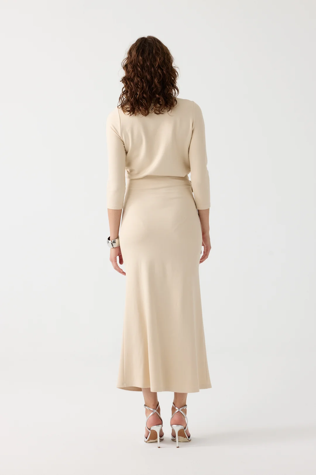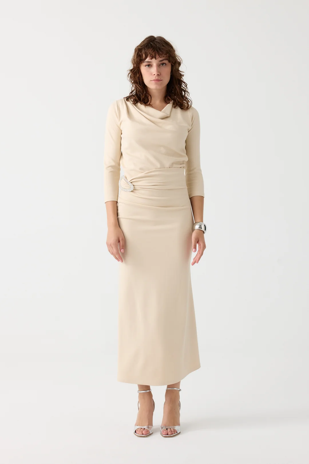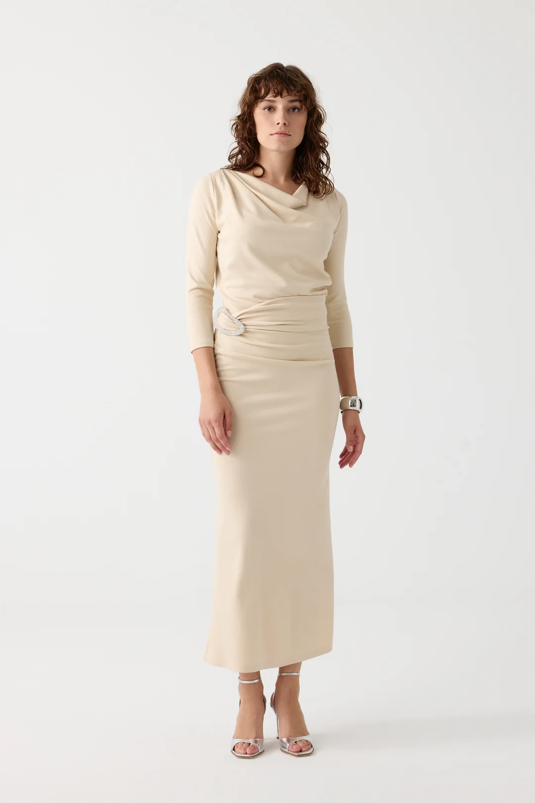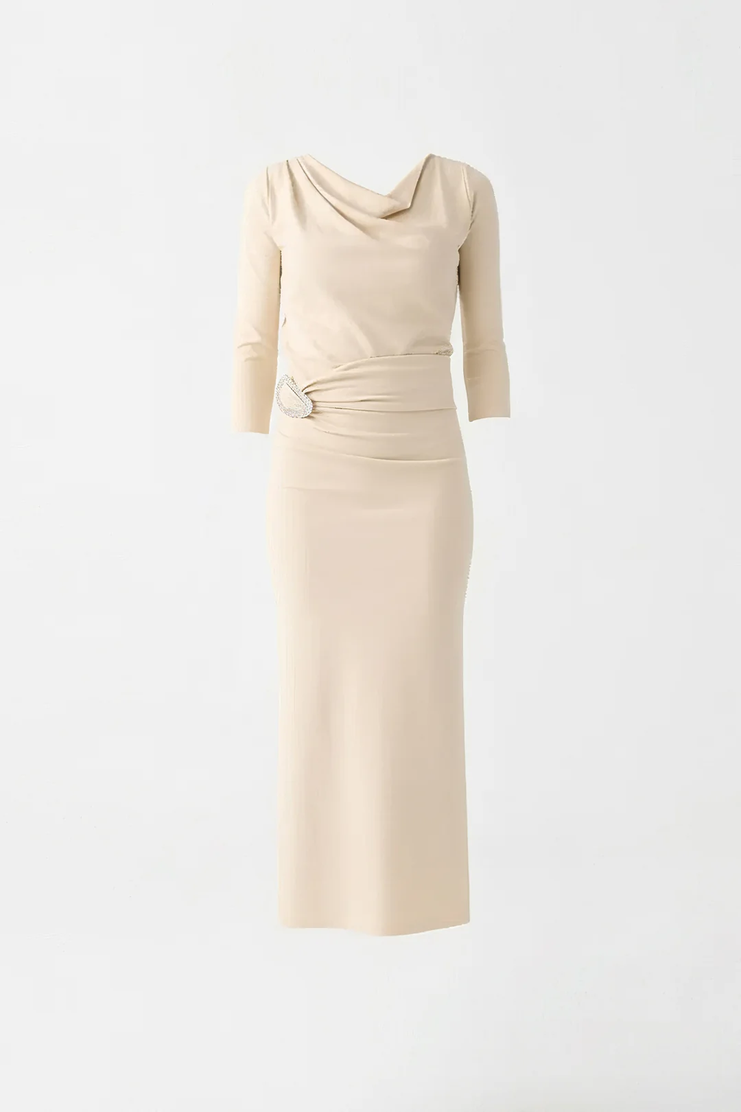 Minimalist tasarımıyla öne çıkan siyah uzun elbise, bel kısmındaki tokalı detayıyla sofistike bir görünüm sunar. Özel davetlerden gece organizasyonlarına kadar şıklığınızı vurgulayan zamansız bir parçadır.