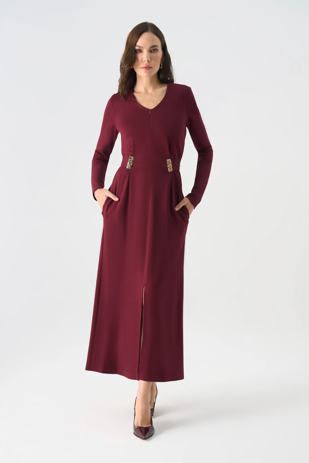 Zarif ve modern çizgilere sahip bu uzun elbise, sade şıklığı ön plana çıkaran tasarımıyla dikkat çeker. Bel kısmındaki metal toka süslemeleri, minimal duruşa zarif bir ışıltı katarken, ön yırtmaç detayı elbiseye zarif bir hareket kazandırır.