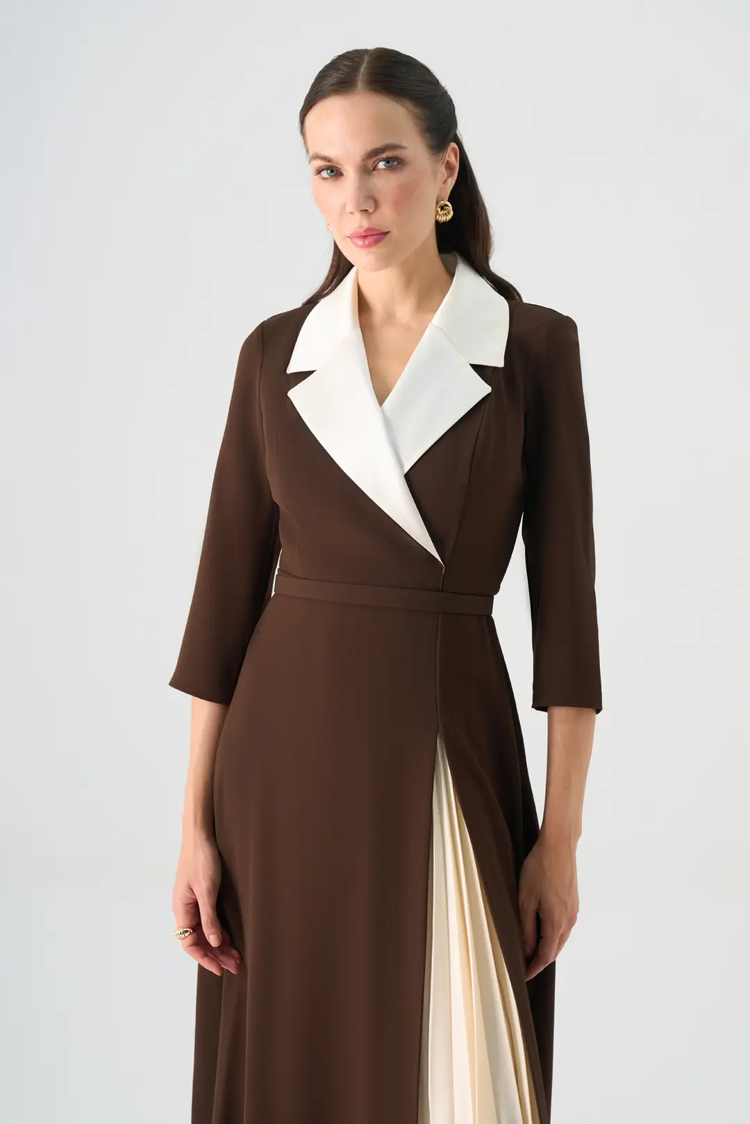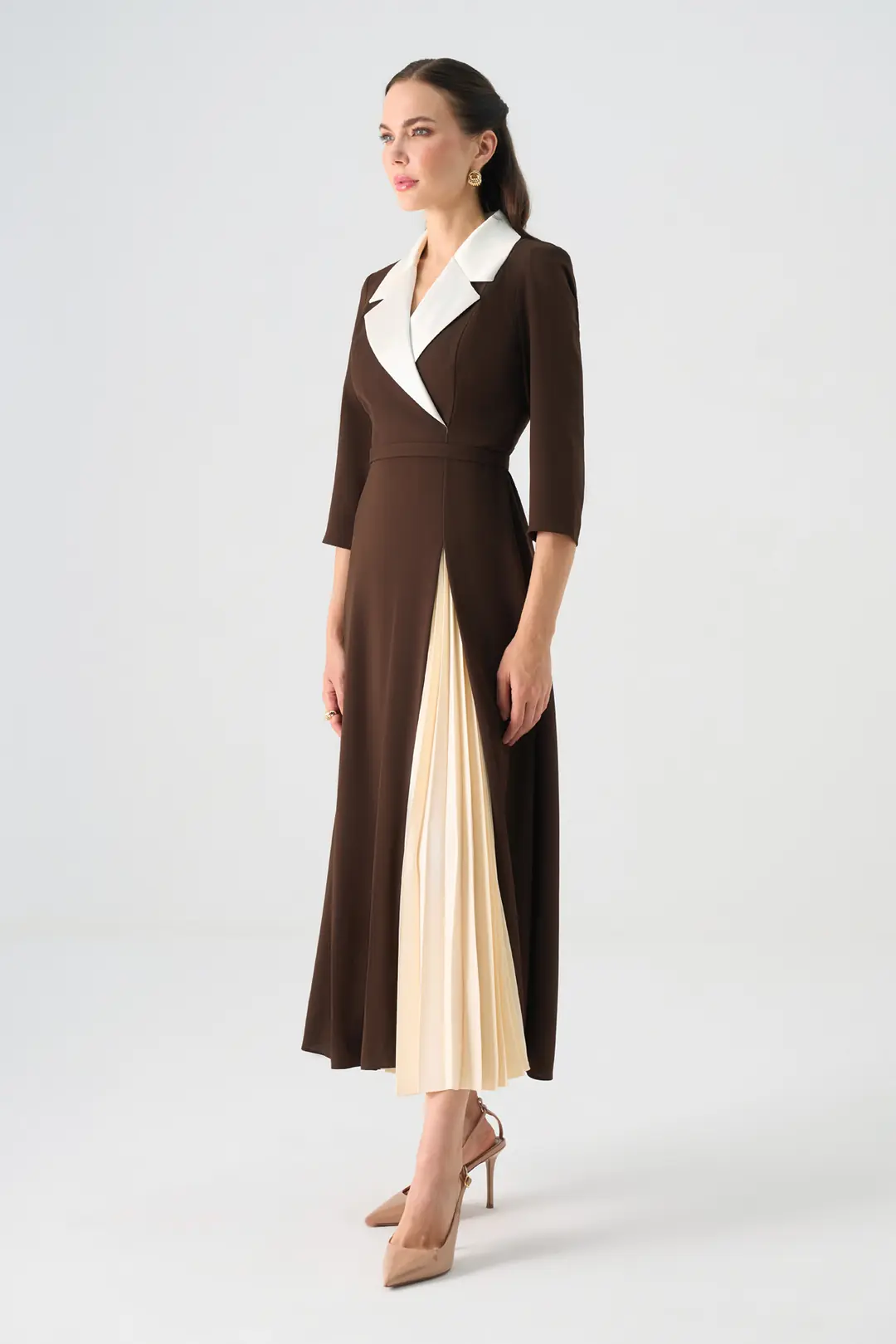Modern çizgileriyle klasik zarafeti buluşturan bu elbise, kruvaze yaka formu ve pliseli etek detayıyla dikkat çeker. Bel hattını vurgulayan tasarımı, vücuda zarif bir form kazandırırken hareket ettikçe açılan pliseli kısım tasarıma dinamik bir hava katar. Üç çeyrek kollu yapısı ve akıcı kumaş dokusu sayesinde hem şık hem konforlu bir kullanım sunar.
