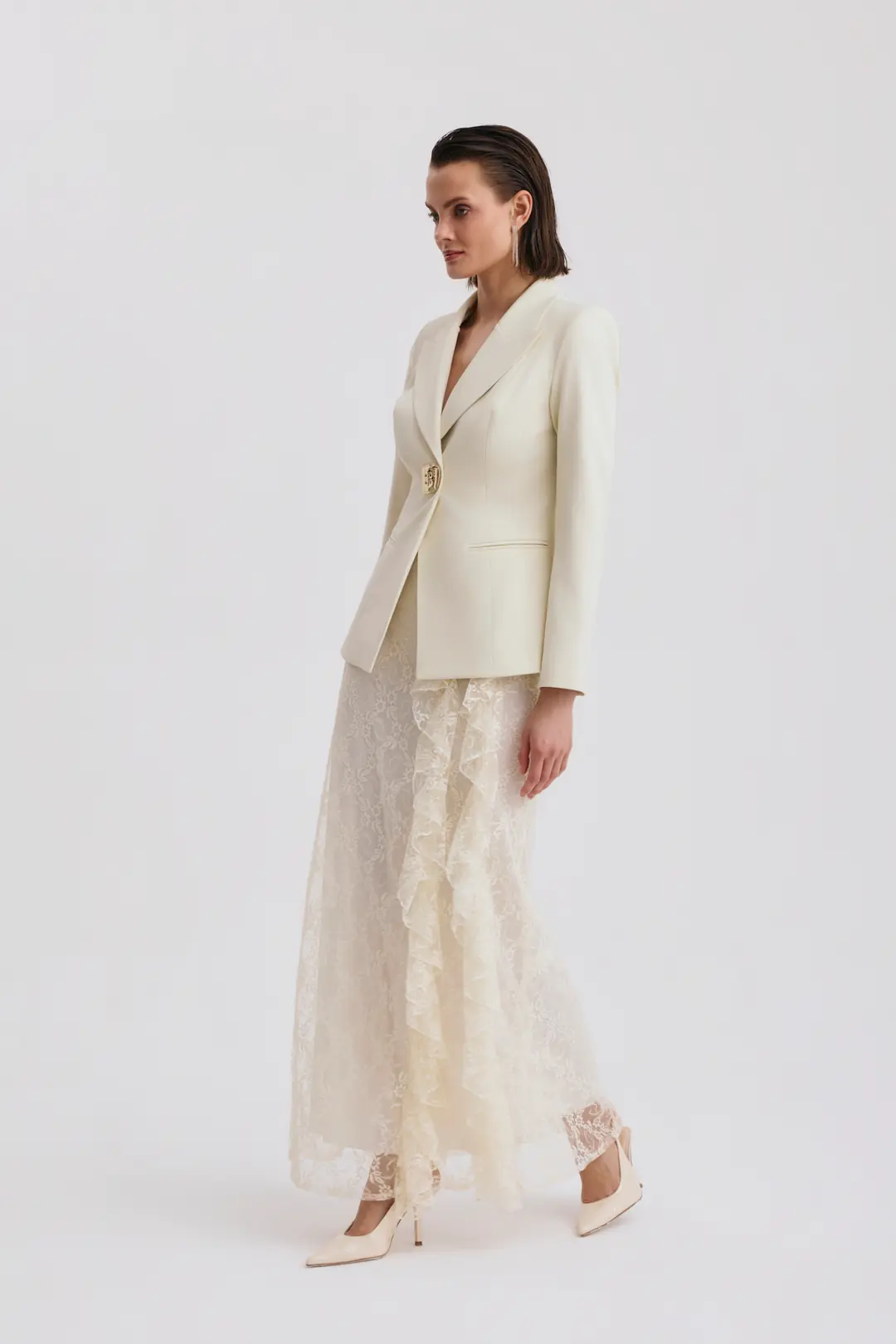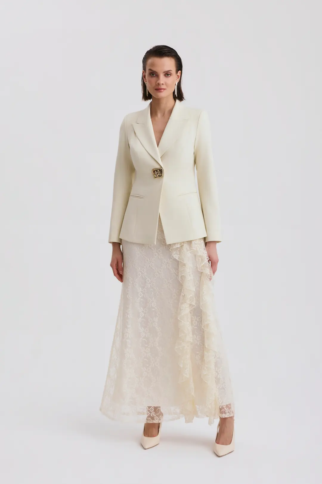 Şıklığı ve zarafeti bir arada sunan blazer ceket ve uzun etek takımı, özel davetlerden resmi organizasyonlara kadar geniş bir kullanım alanı sunar. Vücuda oturan kesimiyle feminen bir siluet oluştururken, tek düğmeli ceket tasarımı modern ve sofistike bir görünüm sağlar. Uzun etek kısmında yer alan dantel dokuma ve volan detayları tasarıma hareket ve romantik bir hava katar.